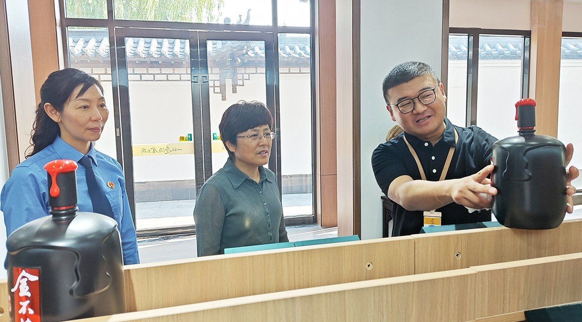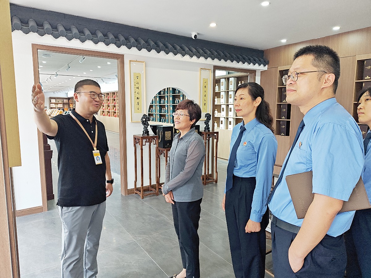 刘继英一行在金不换集团党委书记、总裁支涛的陪同下,实地查看了金不换白酒储藏、销售、生产、文(wén)化展示基地。听取企业生产经营情况和发展规划介绍。刘继英检察長(cháng)对金不换多(duō)年来坚持守法诚信经营,创造良好生产经营环境,取得高质量发展给予高度赞扬。